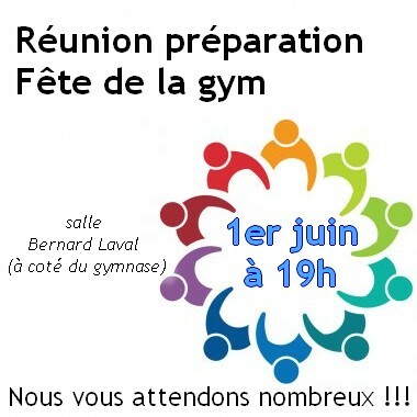 Nous vous invitons à une prochaine réunion de préparation du gala, mercredi 1er juin à 19h à la salle Bernard Laval (à coté du gymnase) pour faire un point d'avancement et lancer les tâches à venir.